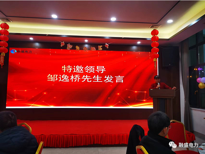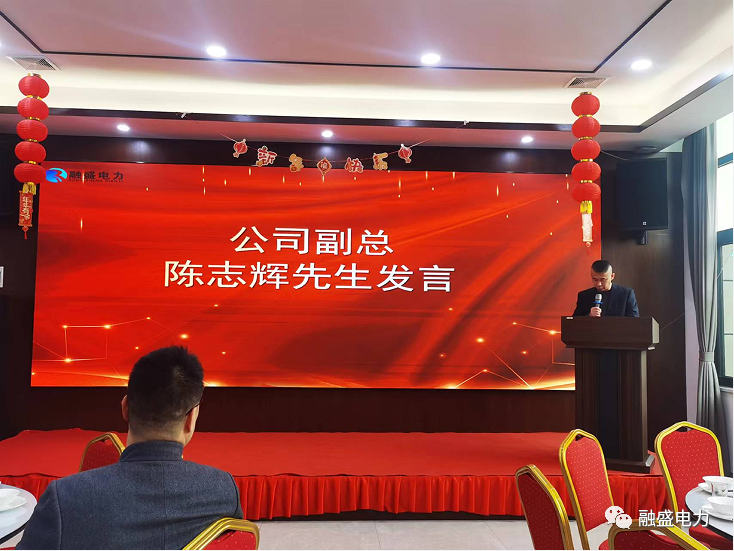 最后,集团董事长陈志刚做新春致辞,他首先表达了对全体融盛人的感谢,2022年在全体融盛人的共同努力下,公司业务保持了持续稳健的发展,取得了良好的成绩,这些成绩是属于每一位融盛人的。公司在2022不仅业绩有所突破,在研发、战略合作、品牌打造、人才引进、投融资方面都取得不错的成绩。2022年公司与华北电力大学签订产学研合作协议,共建“智能配电装备技术与工程应用研究所;与国际一线品牌公司——ABB(中国)有限公司签订技术合作协议、产品代理协议,授权生产中低压成套柜;与湖南港晨建设工程有限公司和岳阳建设工程集团有限公司签订战略合作协议,推进与水利局的战略合作;引进多名高级管理人才和高端专业人才;收购了金科地产集团股份有限公司在岳阳县的全资子公司岳阳天盛房地产开发有限公司100%股权等等。2023年,我们将继续坚持“一个中心”、“二个增长点”,即以“电力”为中心,聚焦电力能源行业,深耕电力工程市场,适年时往电力新能源方向拓展。以“电力工程总承包”和“电力设备制造”双轮驱动,积极推进产线建设、国网、南网入围等工作。最后,董事长向在座的各位致以新年的祝福!